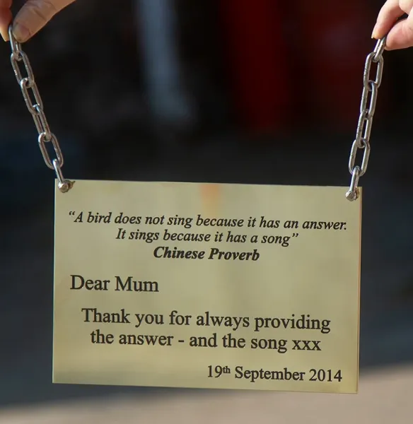 We always try and make our signs and memorials just the way you want them. We were asked for this engraved brass plaque to be hanging so we attached the chains.
