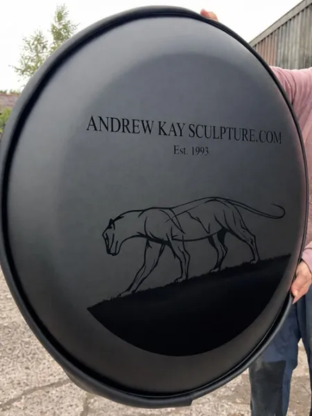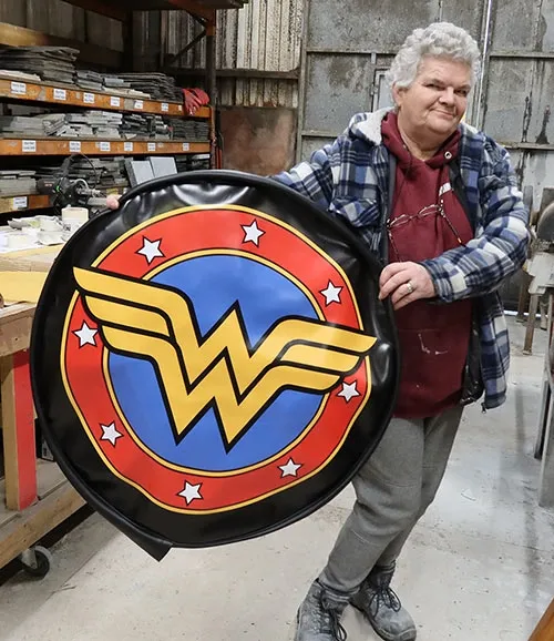 Caroline holding a Wonder Woman wheel cover which was about to be packed and sent to a customer in Switzerland. These wheel covers are made in our workshops to fit any tyre size.